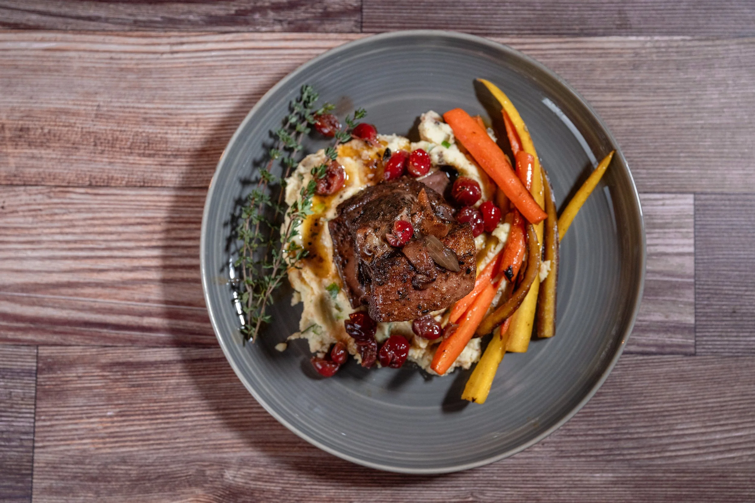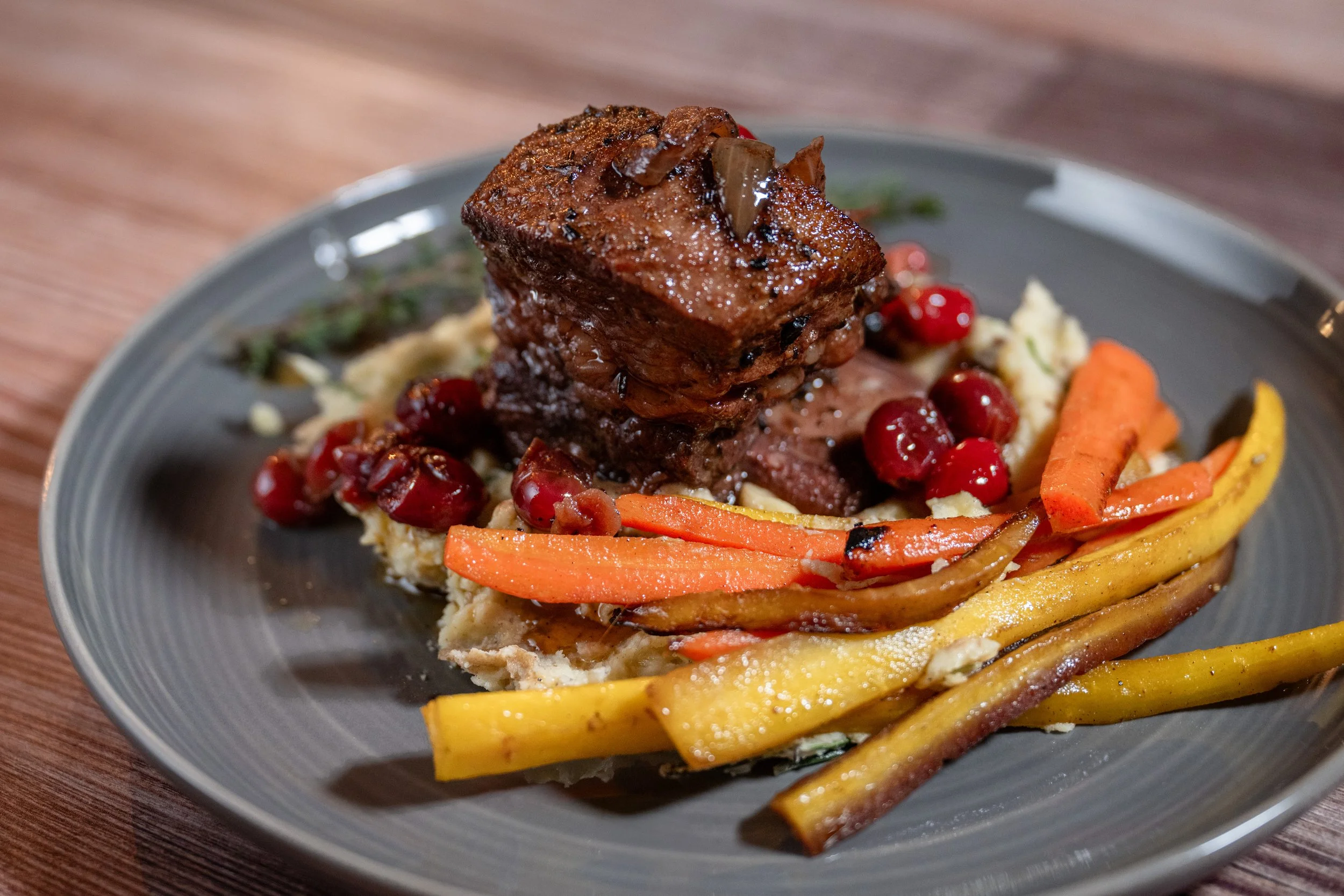 Braised short ribs over mashed potatoes offer a perfect balance of comfort and sophistication. Slow cooking allows the short ribs to develop deep, layered flavor, while the mashed potatoes provide a timeless, comforting base. Colorful carrots add both visual appeal and extra nutrition, and the addition of red wine and cranberries brings complexity and a subtle brightness that elevates the dish.